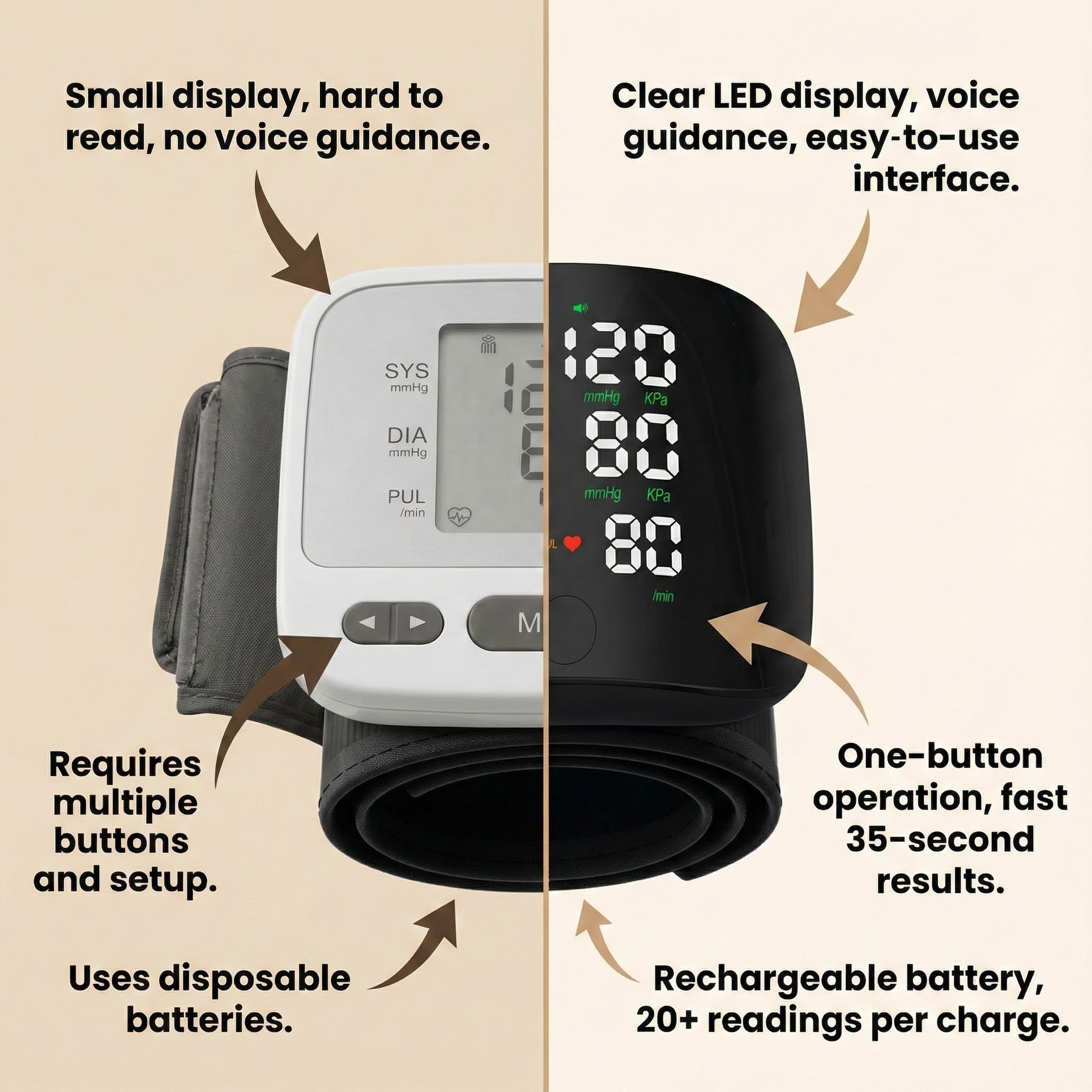 Listen as your reading is announced aloud: “120 over 78, pulse 72.” View the same numbers on the large LED display with color-coded indicators.